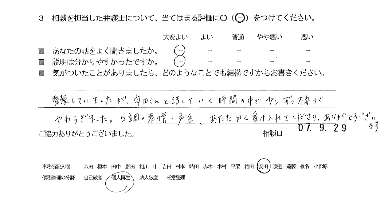 お客様の声(ご相談者の声)評判・口コミ 公開日:2025/10/23 お客様の声(評価・口コミ) ■年代 ■担当弁護士 ■あなたの話をよく聞きましたか ■説明はわかりやすかったですか - 安田 伸一朗 大変よい 大変よい 緊張していましたが、安田さんと話していく時間の中で少しずつ不安がやわらぎました。 口調の表情・声色、あたたかく受け入れてくださり、ありがとうございます。 「お客様の声(ご相談者の声)評判・口コミ」