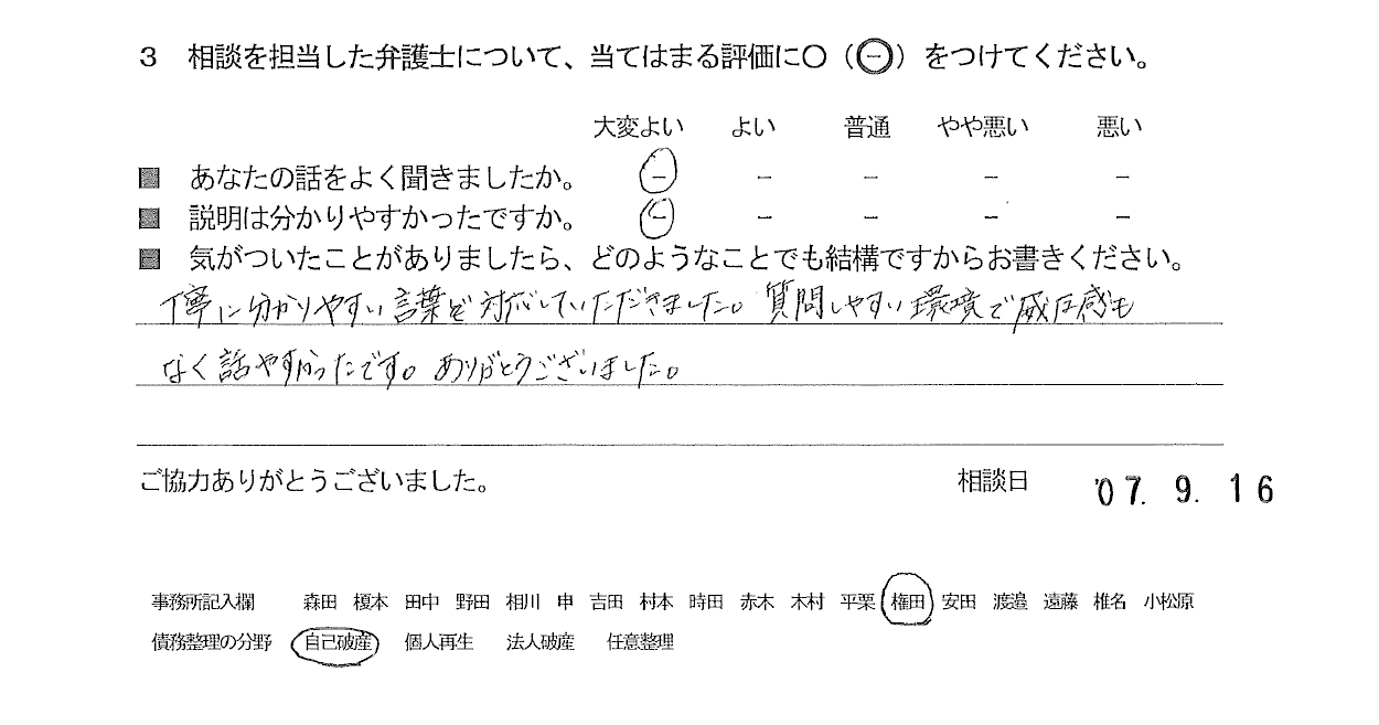 お客様の声(ご相談者の声)評判・口コミ 公開日:2025/10/23 お客様の声(評価・口コミ) ■年代 ■担当弁護士 ■あなたの話をよく聞きましたか ■説明はわかりやすかったですか - 権田 健一郎 大変よい 大変よい 丁寧に分かりやすい言葉で対応していただきました。質問しやすい環境で威圧感もなく話やすかったです。ありがとうございました。 「お客様の声(ご相談者の声)評判・口コミ」 「お客様の声(ご相談者の声)評判・口コミ」