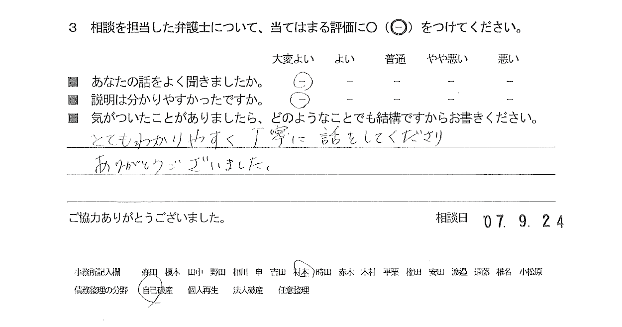 お客様の声(ご相談者の声)評判・口コミ 公開日:2025/10/23 お客様の声(評価・口コミ) ■年代 ■担当弁護士 ■あなたの話をよく聞きましたか ■説明はわかりやすかったですか - 村本 拓哉 大変よい 大変よい とてもわかりやすく丁寧に話をしてくださりありがとうございました。 「お客様の声(ご相談者の声)評判・口コミ」 「お客様の声(ご相談者の声)評判・口コミ」
