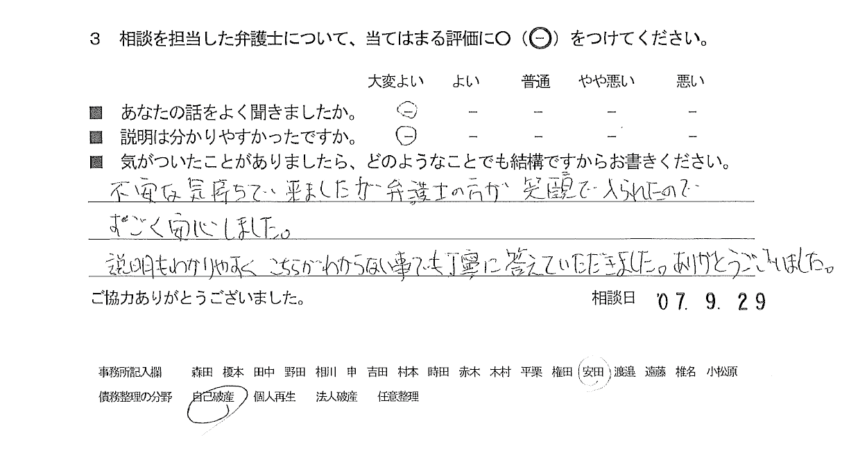お客様の声(ご相談者の声)評判・口コミ 公開日:2025/10/23 お客様の声(評価・口コミ) ■年代 ■担当弁護士 ■あなたの話をよく聞きましたか ■説明はわかりやすかったですか - 安田 伸一朗 大変よい 大変よい 不安な気持ちで来ましたが弁護士の方が笑顔で入られたのですごく安心しました。 説明もわかりやすくこちらがわからない事でも丁寧に答えていただきました。ありがとうございました。 「お客様の声(ご相談者の声)評判・口コミ」 「お客様の声(ご相談者の声)評判・口コミ」