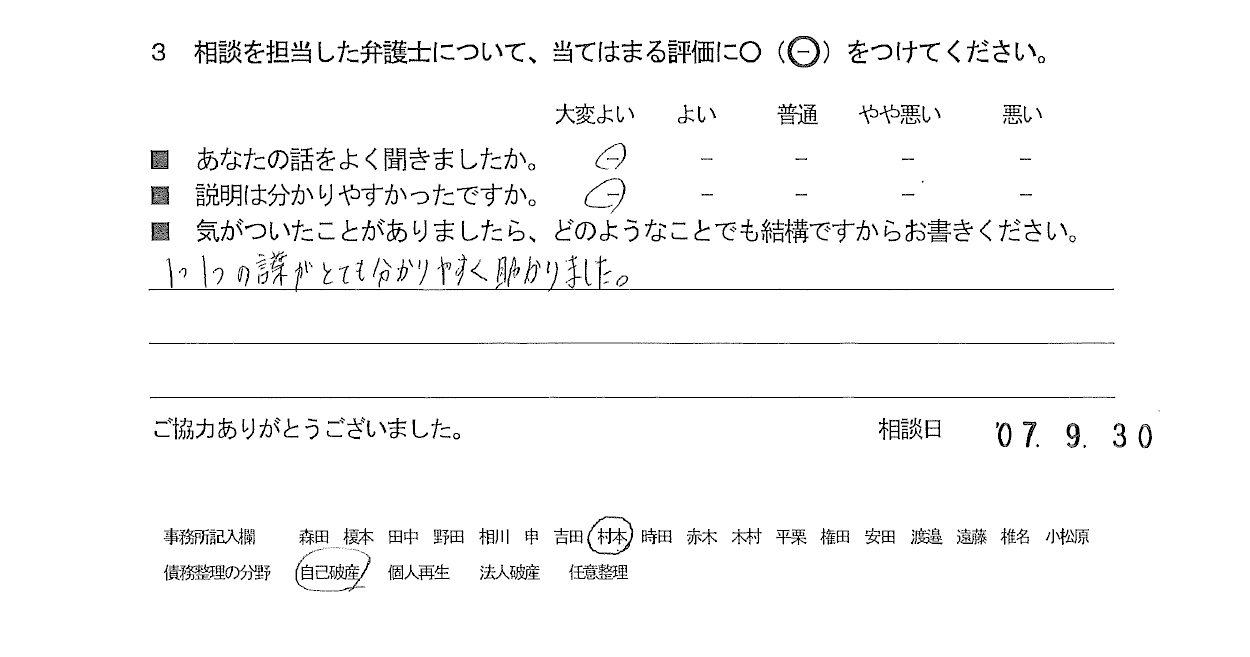 お客様の声(ご相談者の声)評判・口コミ 公開日:2025/10/23 お客様の声(評価・口コミ) ■年代 ■担当弁護士 ■あなたの話をよく聞きましたか ■説明はわかりやすかったですか - 村本 拓哉 大変よい 大変よい 1つ1つの言葉がとても分かりやすく助かりました。 「お客様の声(ご相談者の声)評判・口コミ」 「お客様の声(ご相談者の声)評判・口コミ」