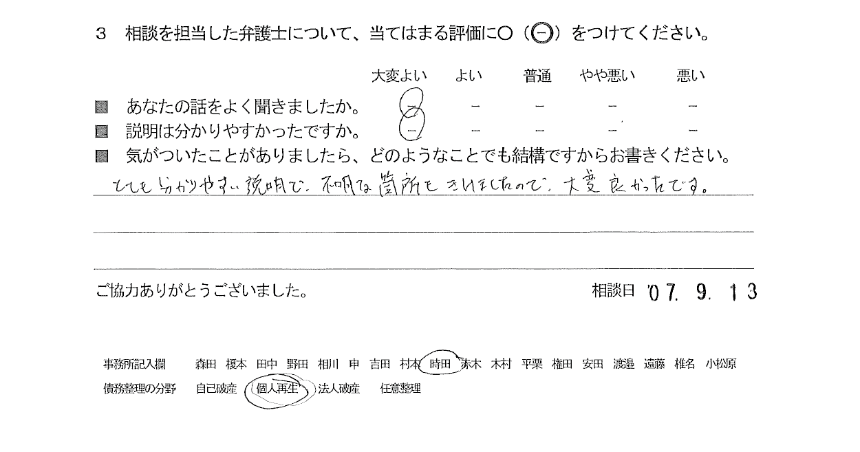 お客様の声(ご相談者の声)評判・口コミ 公開日:2025/10/23 お客様の声(評価・口コミ) ■年代 ■担当弁護士 ■あなたの話をよく聞きましたか ■説明はわかりやすかったですか - 時田 剛志 大変よい 大変よい とても分かりやすい説明で、不明な箇所をきけましたので、大変良かったです。 「お客様の声(ご相談者の声)評判・口コミ」 「お客様の声(ご相談者の声)評判・口コミ」