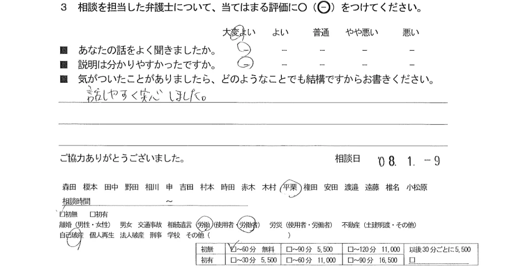 お客様の声(ご相談者の声)評判・口コミ 公開日:2026/02/13 お客様の声(評価・口コミ) ■担当弁護士 平栗 丈嗣 ■あなたの話をよく聞きましたか 大変よい ■説明はわかりやすかったですか 大変よい 話しやすく安心しました。 関連記事: お客様の声(ご依頼者の声)口コミ・評判 お客様の声(ご相談者の声)口コミ・評判 お客様の声(ご相談者の声)評判・口コミ お客様の声(ご依頼者の声)評判・口コミ 「お客様の声(ご相談者の声)評判・口コミ」 「お客様の声(ご相談者の声)評判・口コミ」