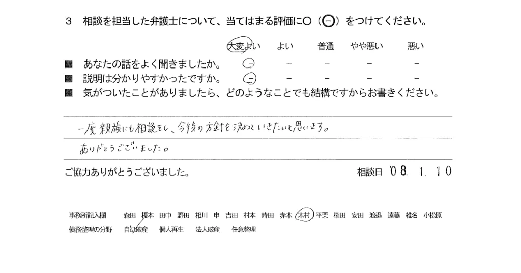 お客様の声(ご相談者の声)評判・口コミ 公開日:2026/02/13 お客様の声(評価・口コミ) ■担当弁護士 木村 綾菜 ■あなたの話をよく聞きましたか 大変よい ■説明はわかりやすかったですか 大変よい 一度親族にも相談をし、今後の方針を決めていきたいと思います。ありがとうございました。 関連記事: お客様の声(ご相談者の声)口コミ・評判 お客様の声(ご相談者の声)評判・口コミ お客様の声(ご相談者の声)評判・口コミ お客様の声(ご相談者の声)評判・口コミ 「お客様の声(ご相談者の声)評判・口コミ」 「お客様の声(ご相談者の声)評判・口コミ」