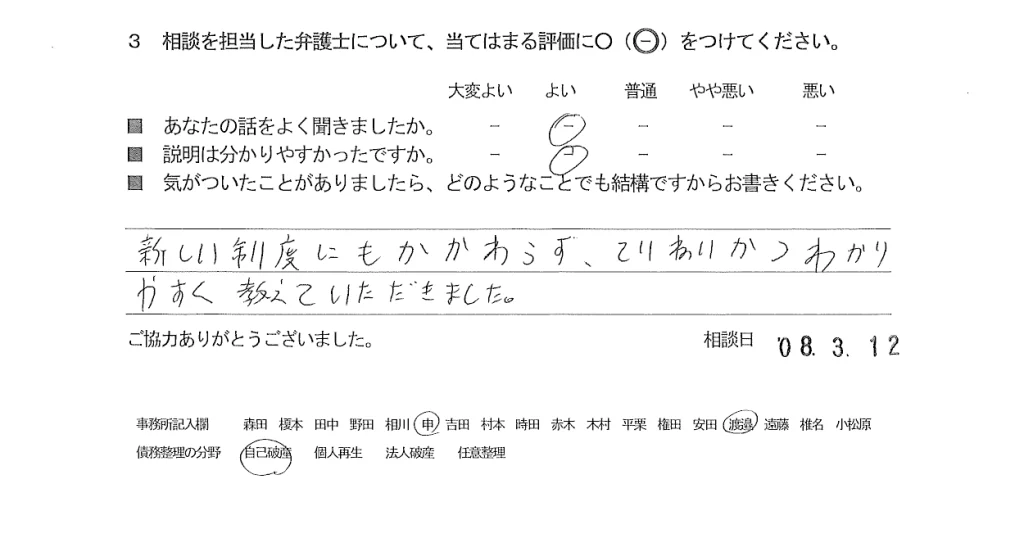 お客様の声(ご相談者の声)評判・口コミ 公開日:2026/04/30 お客様の声(評価・口コミ) ■担当弁護士 申 景秀 ■あなたの話をよく聞きましたか よい ■説明はわかりやすかったですか よい 新しい制度にもかかわらず、ていねいかつわかりやすく教えていただきました。 関連記事: お客様の声(ご依頼者の声)口コミ・評判 お客様の声(ご依頼者の声)口コミ・評判 お客様の声(ご依頼者の声)評判・口コミ お客様の声(ご依頼者の声)評判・口コミ 「お客様の声(ご相談者の声)評判・口コミ」 「お客様の声(ご相談者の声)評判・口コミ」